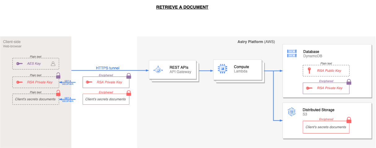 - L'utilisateur (via la WebUI Astry) appelle une API pour récupérer à la fois la clé privée de son coffre-fort (qui est elle-même chiffrée via le mot de passe configuré plus haut) et les documents chiffrés qu'il souhaite récupérer.