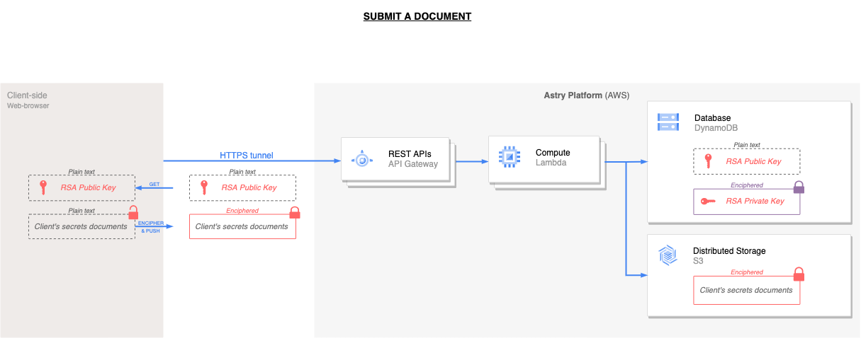 Les documents déposés, le mot de passe configuré par l'utilisateur, et la clé privée du coffre-fort, ne sont donc jamais transmis (ni stockés) sur les serveurs Astry.