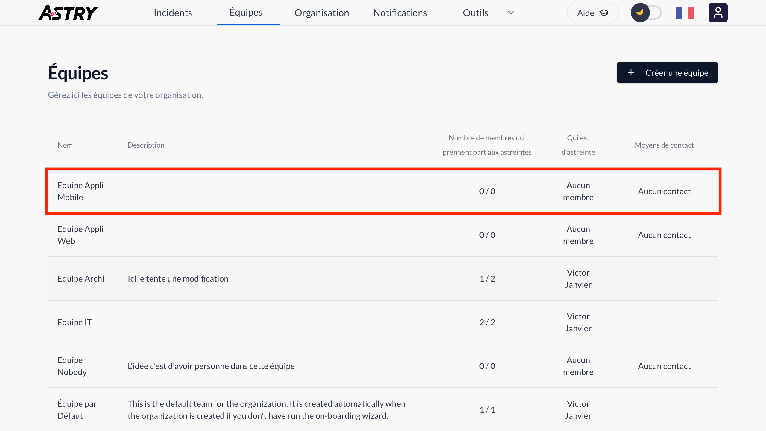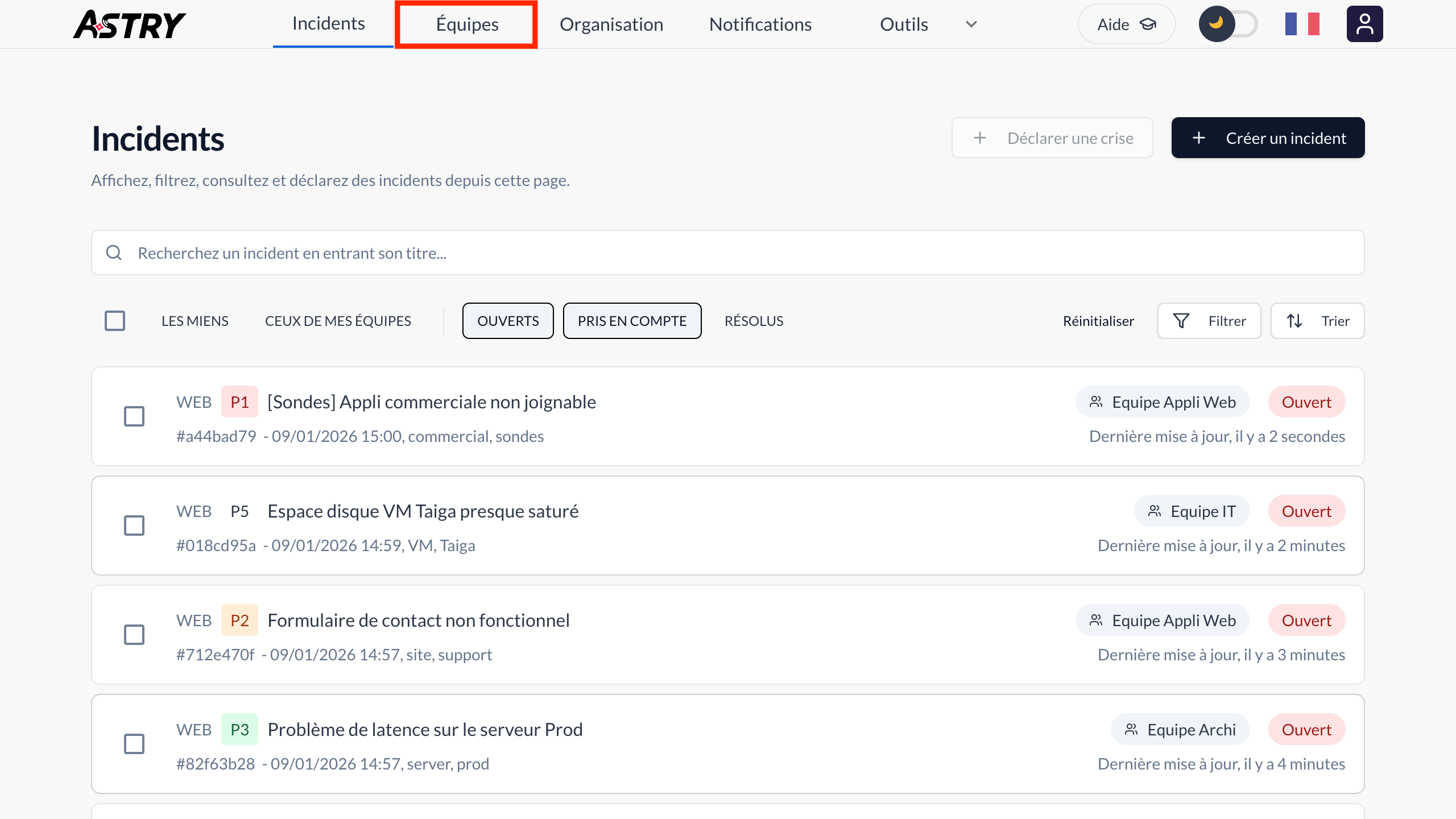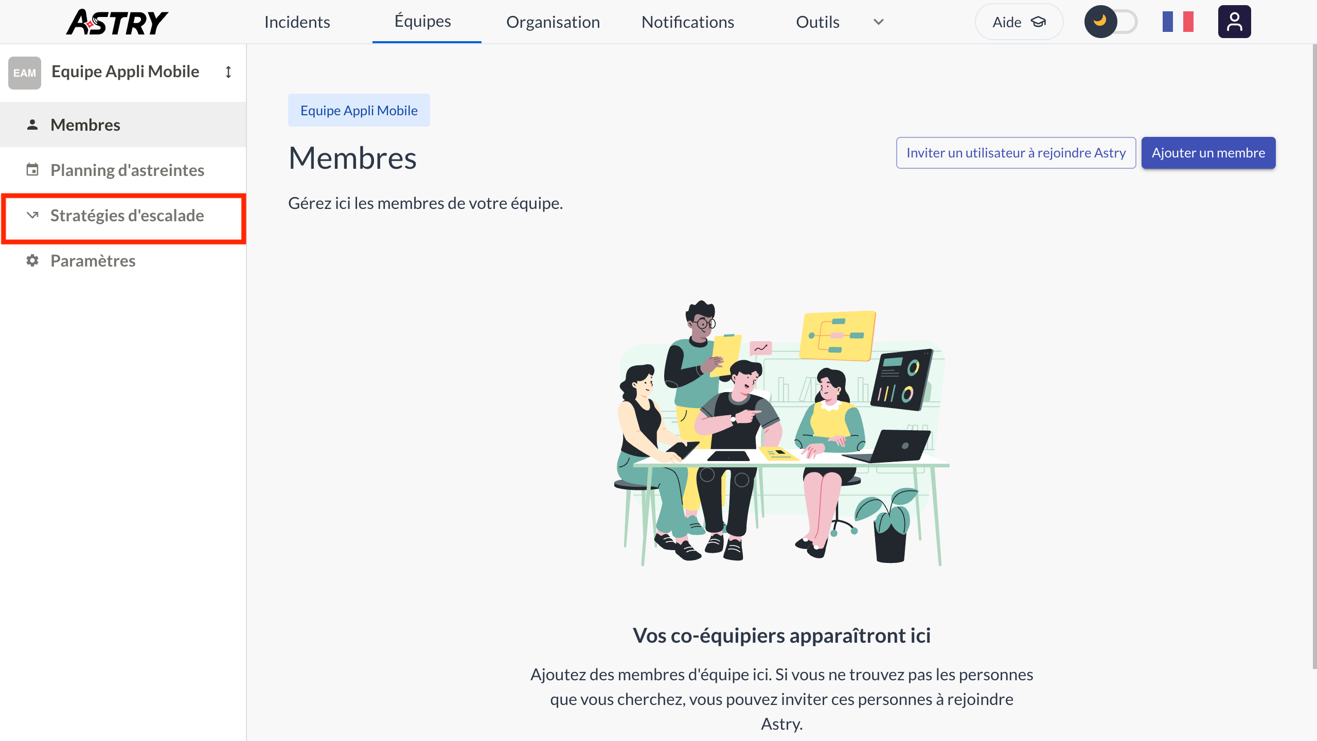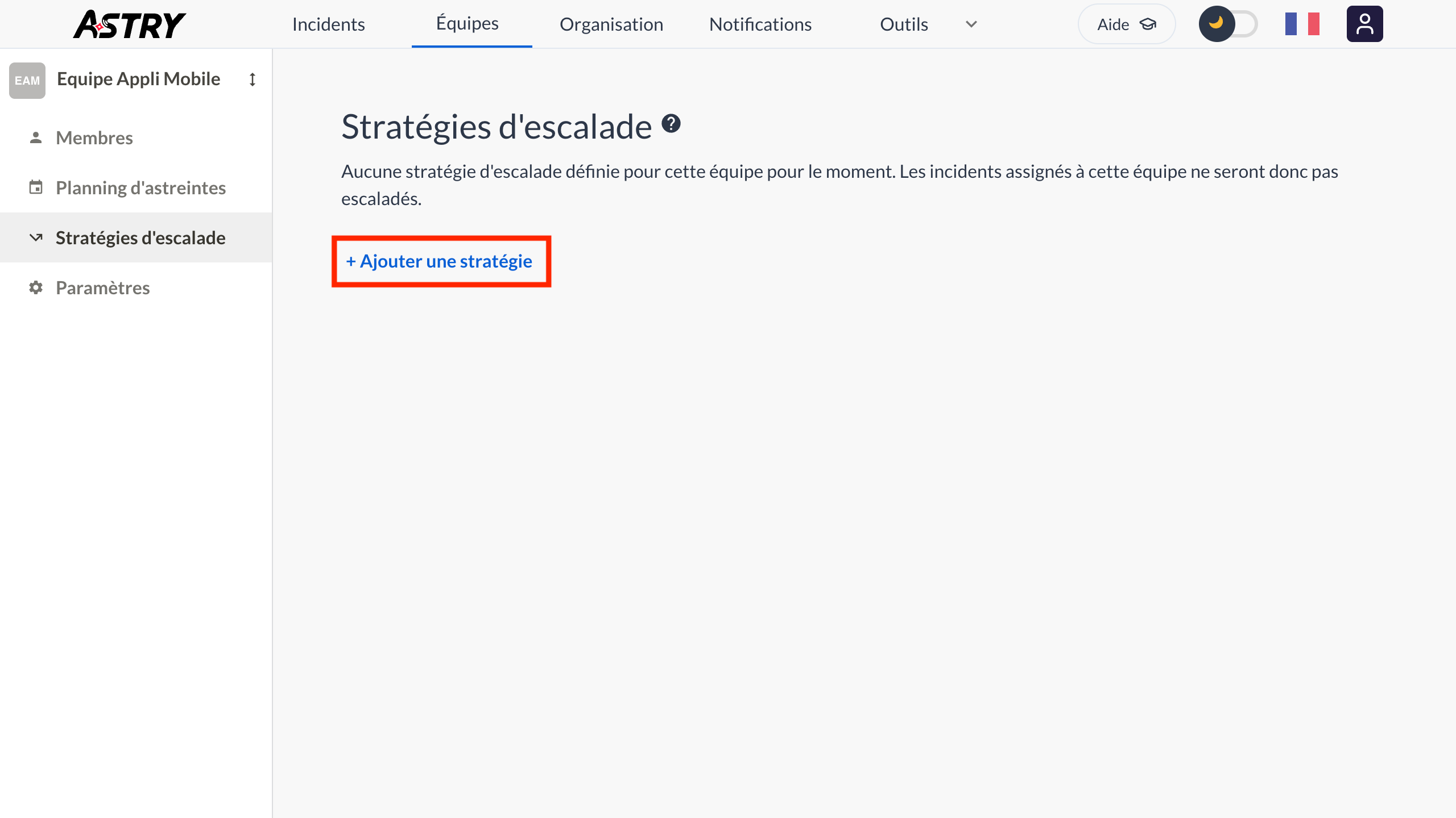 Pour configurer une procédure d'escalade automatique d'incidents, vous devez vous rendre dans l'onglet Équipes.