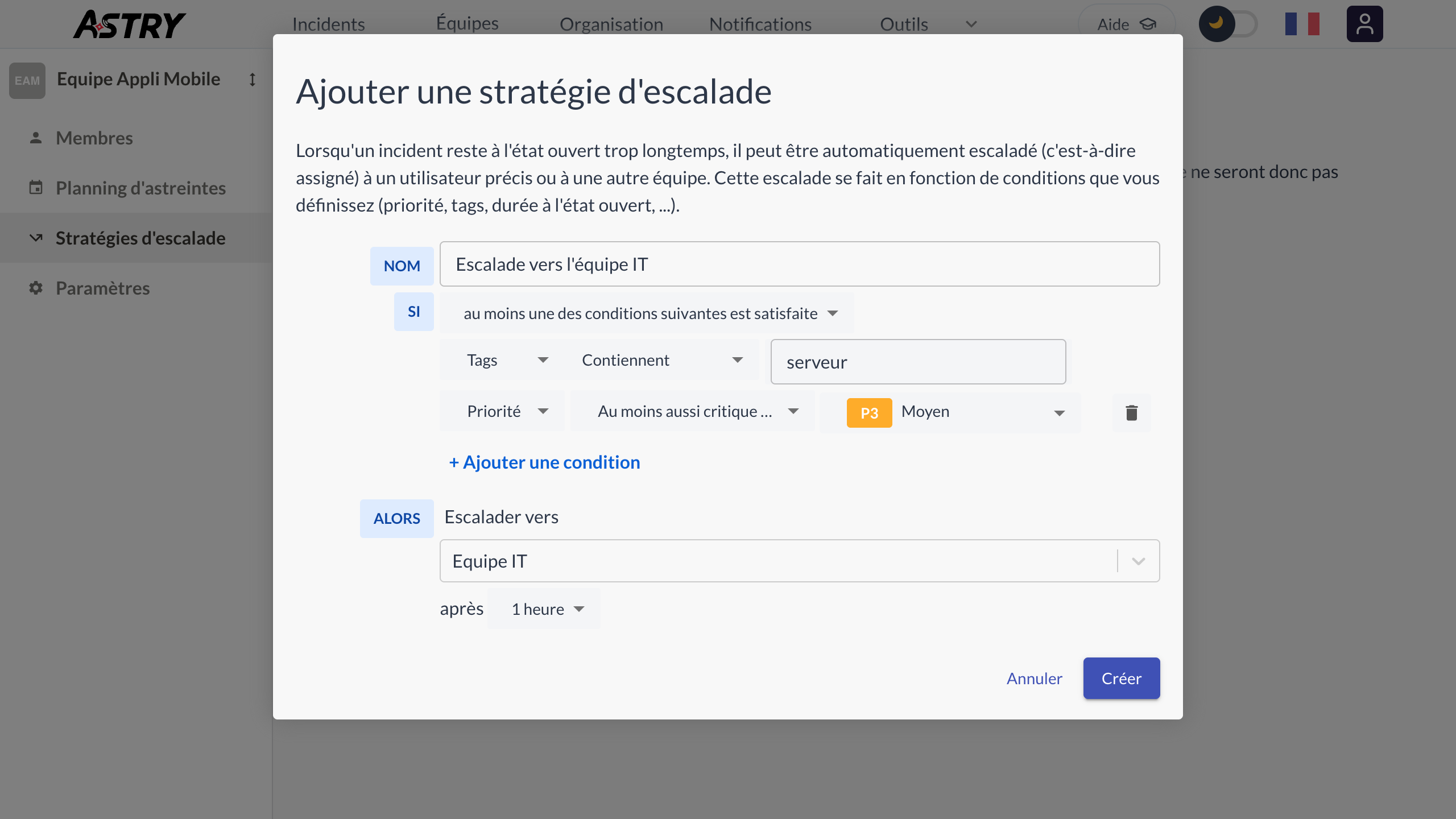 - optionnellement des conditions que doivent remplir les incidents à escalader (par exemple "il contient le tag 'serveur', ou sa priorité est P3 au moins")