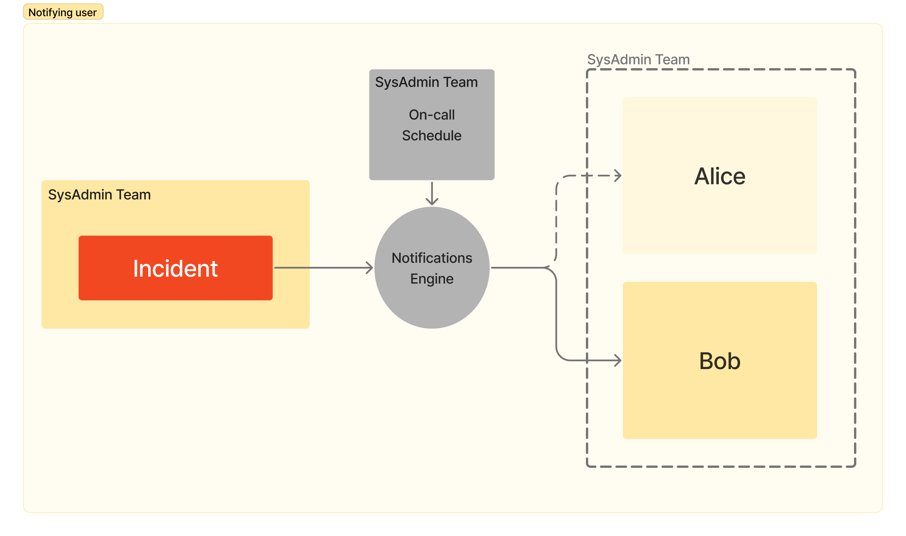 À tout moment un membre d'équipe au maximum est considéré comme d'astreinte pour son équipe. Lorsqu'un incident est levé, c'est ce membre qui sera notifié (suivant ses stratégies de notifications).